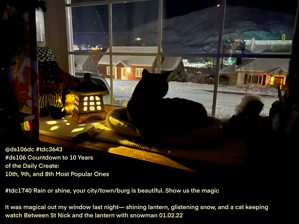 Number 8: #tdc1740 Rain or shine, your city/town/burg is beautiful. Show us the magic — It was magical out my window last night— shining lantern, glistening snow, and a cat keeping watch between St Nick and the lantern with snowman