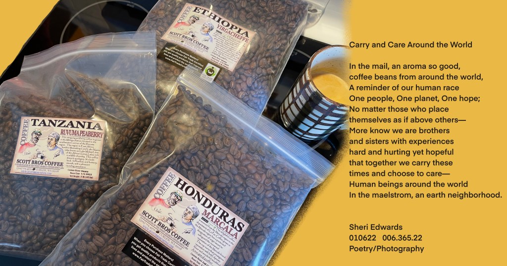 Every day, a photograph, a poem. We order coffee beans from Scott Brothers Coffee in Kettle Falls, WA. Today we delighted in a new flavor: Ruvuma Peaberry, a buttery rich and unique blend from Tanzania. It reminded us that our coffee takes us around the world, this small world, and no matter what the isolationist and supremacists of the January 6th attack on the United States Capital and our elections, we are a diverse and connected world of one human race— unique as each one of us and yet all struggling for our families and communities. They cannot deny us our belief in brotherhood and equality.