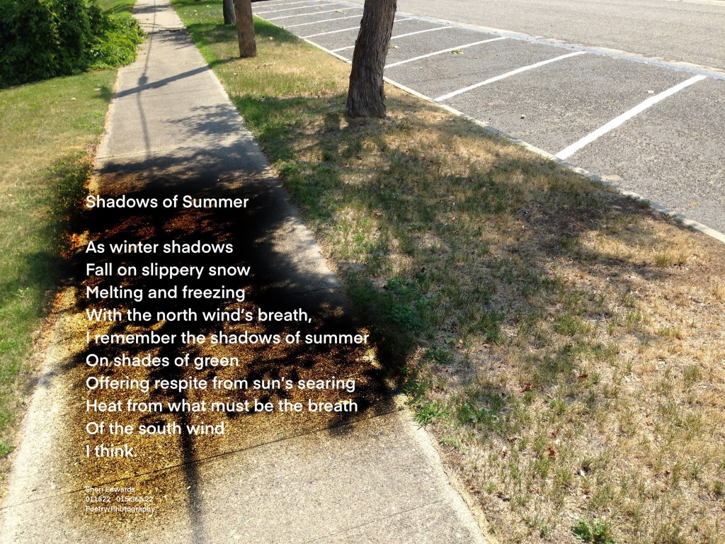 Every day, a photograph, a poem. Though I love the brightness of sunshine on a snowy day, the walk across the snow can be treacherous, given our fluctuating temperatures of warming and freezing. I sigh and remember the sunshine of summer, a shadow of memory today.
