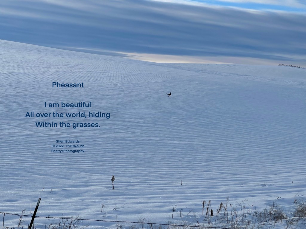 Every day, a photograph, a poem. A while ago, when the first cold and first snow blanketed the area, our drive met a surprise running across the snow. Usually, pheasants hide in the tall grasses and crops in the fields. But today, this one ran across the snow and back to its hiding place as we drove by. I was surprised I caught him on camera on my iPhone.
