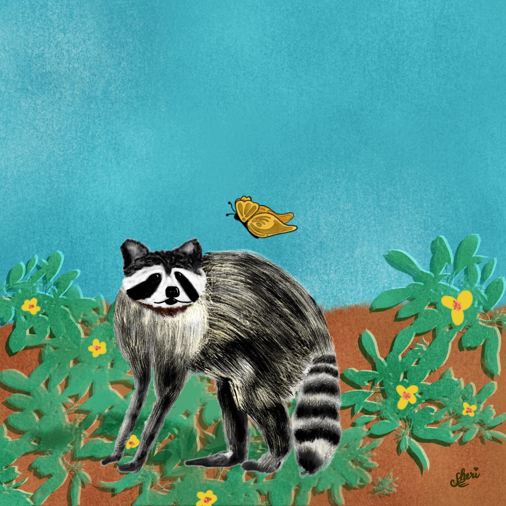 ”Raccoon” is the prompt today from Lisa Bardot’s #makingarteveryday and the raccoon meets a butterfly in the meadow