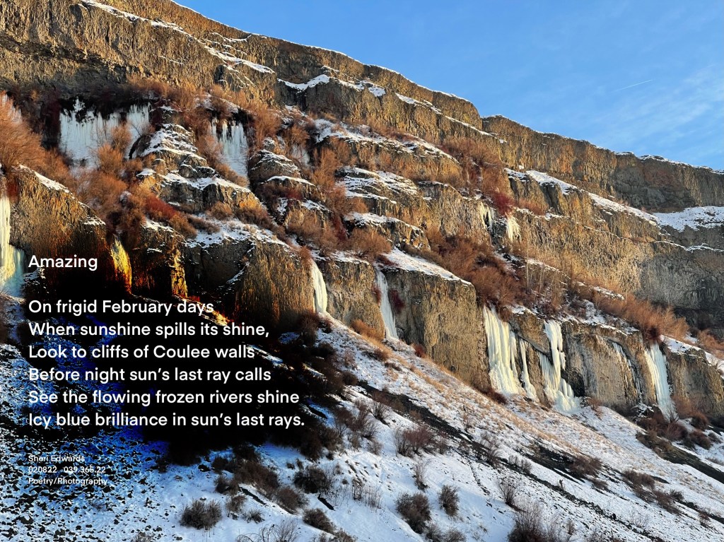 Every day, a photograph, a poem. This weekend we hopped in the truck and drove to find the sunshine and amazingly discovered the shining and icy blue frozen waterfalls on the Coulee walls. Beautiful.
