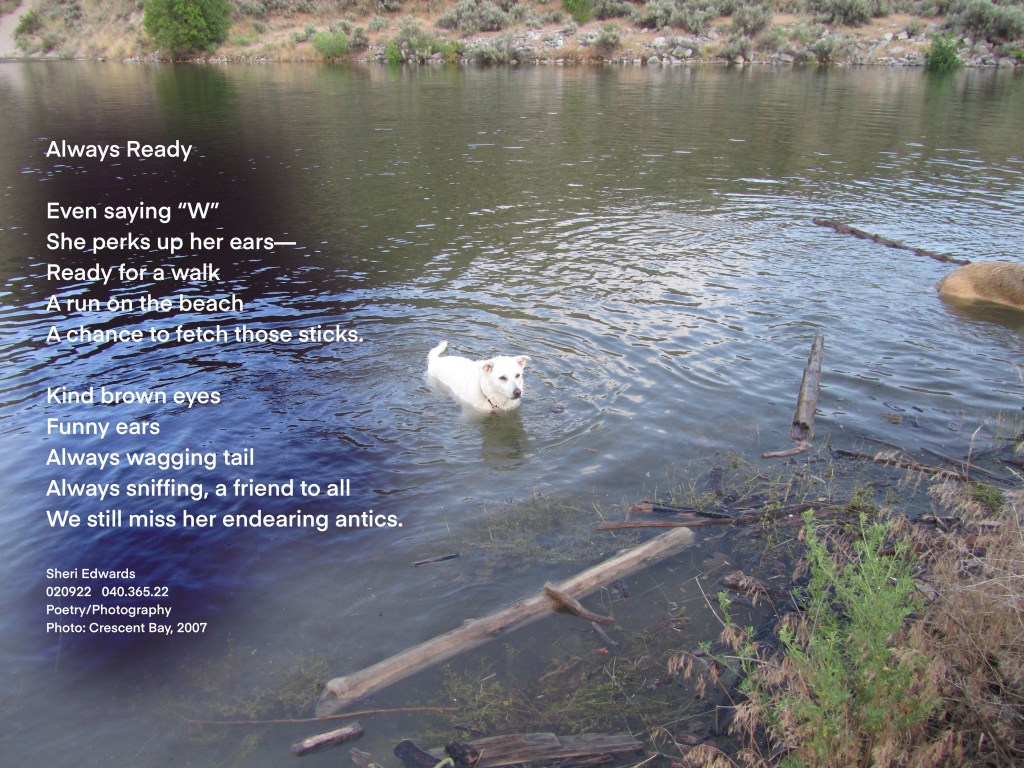 She was one of those personalities, lazy and not demanding, and always wanting to please— whoever she is with, including all the grandkids whom she would let hold her tail while she swam, pulling them along with her. A lovely soul, kindness only. Although we did need to curb her rushing the deer and rabbits, and she, for the most part, listened. We miss her, our only dog.