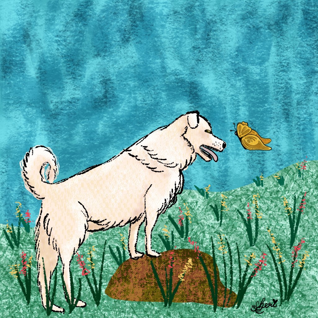 “Dog” is the prompt today from Lisa Bardot’s #makingarteveryday [Animals: Pets] and this little dog has been chasing the butterfly, wagging her tail at meeting a new friend.