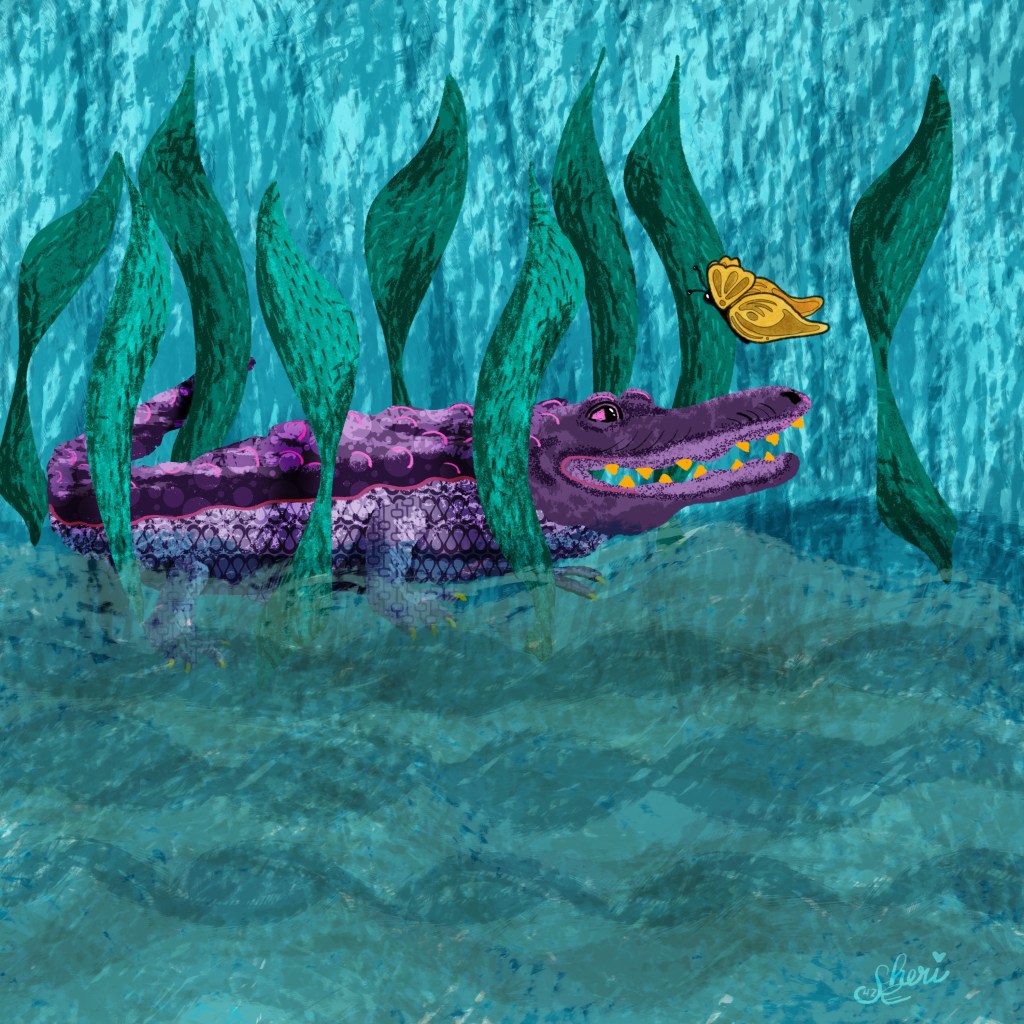 “Alligator” is the prompt today from Lisa Bardot’s #makingarteveryday [Animals: Wild] and what a surprise to see butterfly floating over the Everglades to find her friend the alligator.