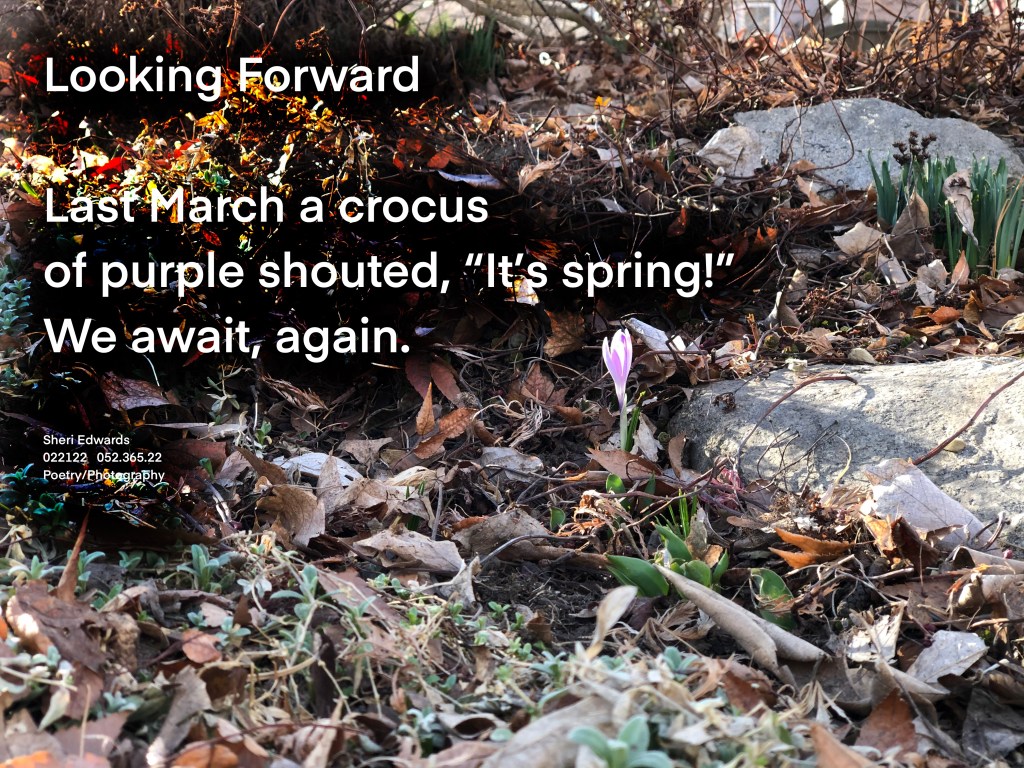 Every day, a photograph, a poem. Oh, the cold is coming again, so I searched in my photos for March pictures and found this hopeful little crocus of last year’s spring to remind us: it’s coming!