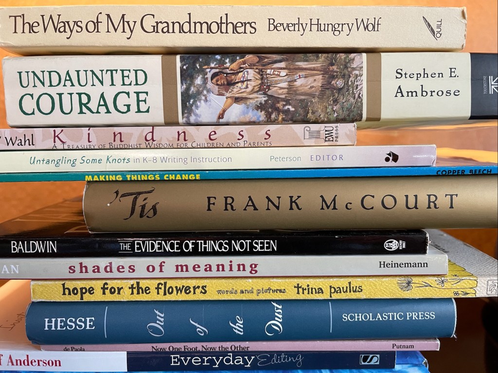 Today is an example of my slice of life: a daily goal of photo/poem, Daily Create, and art/doodle. This is the #ds106 Daily Create @ds106dc #tdc3695 Spine Poem—- books from my own library. I thought today of my grandparents who lived through two world wars and a Great Depression, as well as floods, droughts, and tornadoes. I think we’ll make it through this time, and freedom will win— freedom for all, not just “one way.” We’ll put one foot in front of the other and with undaunted courage and kindness, bring hope for the flowers and us.