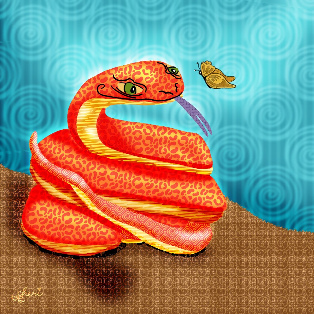 “Snake” is the prompt today from Lisa Bardot’s #makingarteveryday[Animals: Wild] and butterfly is not to sure about this mesmerizing snake.