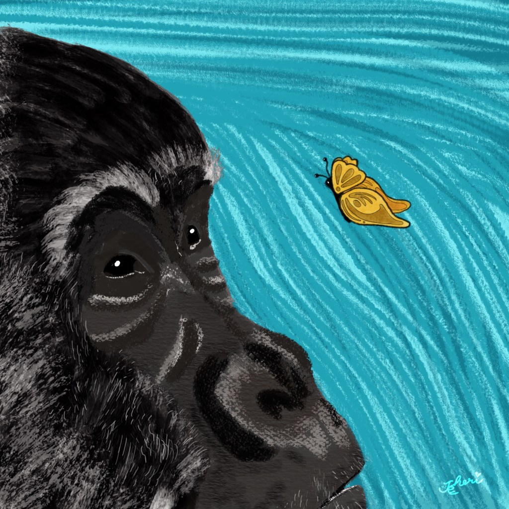 “Gorilla” is the prompt today from Lisa Bardot’s #makingarteveryday [Animals: Wild] and this little gorilla is wondering what is that butterfly trying to say?