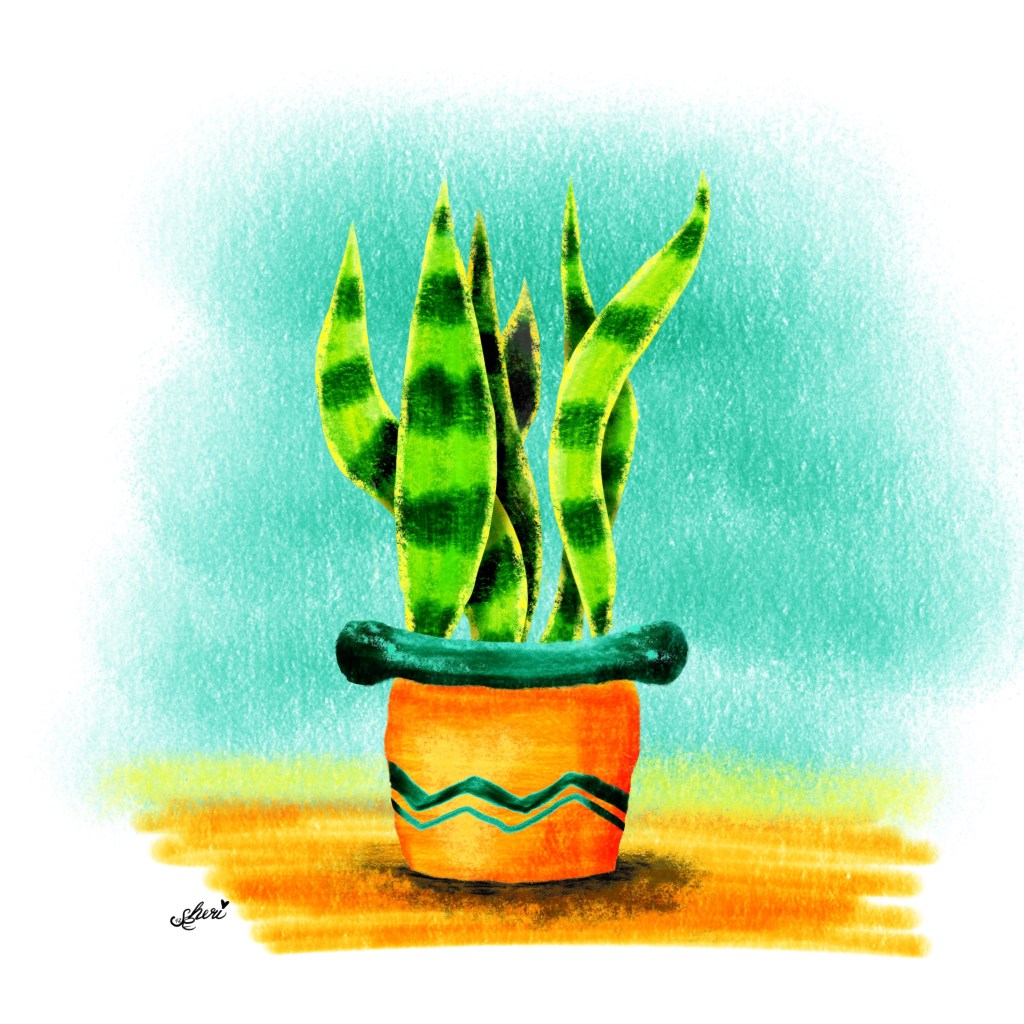 “Snake Plant” Sansevieria is the prompt today from Lisa Bardot’s #makingarteveryday [Grow: Potted Plants]. I chose again to include the yellow and blue colors for peace in Ukraine