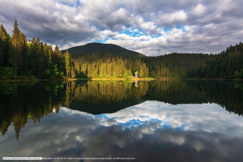 Look below at this beautiful, peaceful photo of Synevyr National Nature Park, Ukraine By Misha Reme, CC BY-SA 4.0, found in Wikimedia Commons. It’s just the type of peaceful respite my mind had imagined, a place to pause and listen for the melody of song birds, the chattering of chipmunks, and the stomp of a nearby doe warning the fawn behind it.