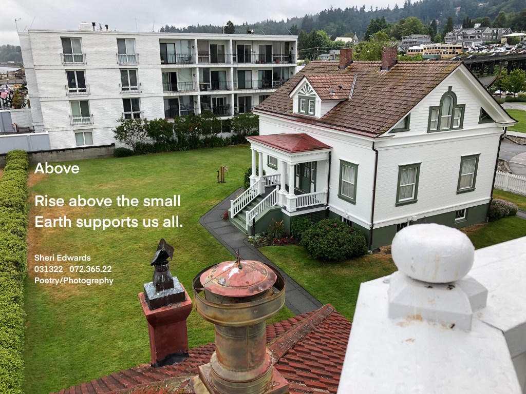 Every day, a photograph, a poem. On my iPad, a daily picture pops up to surprise me. This lighthouse on the Washington coast shows a view below the climb to the light in the lighthouse. It’s a view that shows the apartments next door and hopes on the hills, a view that shows the earth has room for all of us. There is no need for war. So that idea became the start of a short poem because today is a busy day of cleaning up after a work crew.