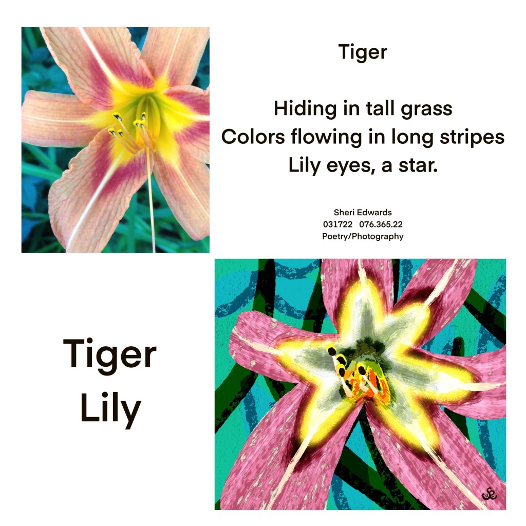 So I took time to just doodle a bit — this tiger lily and poem, the flower that once bloomed profusely in our yard but has stopped growing over the past few years. I miss their brilliant beauty.