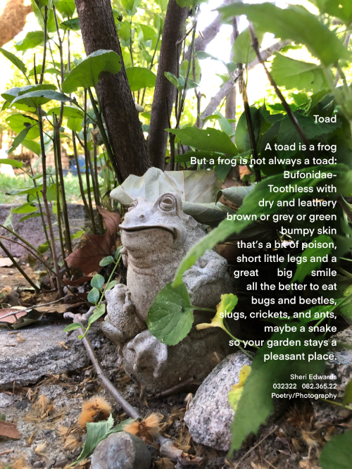 My friend Lori and I, while in high school, captured a pair of toads along the Missouri River, keeping them as pets over the summer in the backyard until they escaped. We named them too: Erwin and Edwin P Soup. We’ve been sharing toads and frogs with one another ever since. We have many toads and frogs in our yards and houses. Above is a picture of one from Lori.