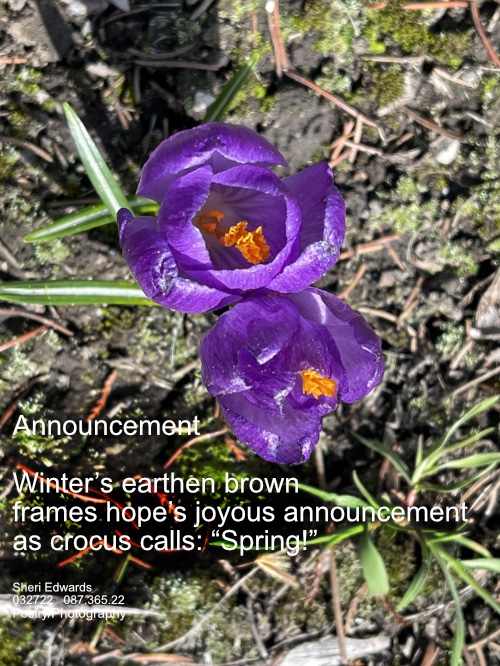 Every day, a photograph, a poem. Yesterday, as I wrote my morning poem about the lack of spring blossoms of renewal and hope, these little crocus popped up in the park to our joy for our walk later that day.