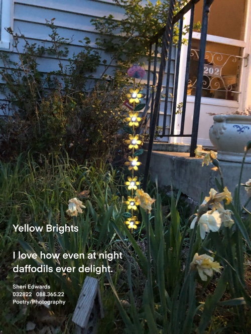 Every day, a photograph, a poem. Arriving hope one evening, the fairies looked to be dancing in our yard, yet I know that the delightful yellow glow is from the lovely daffodils, still so beautiful in the night light.