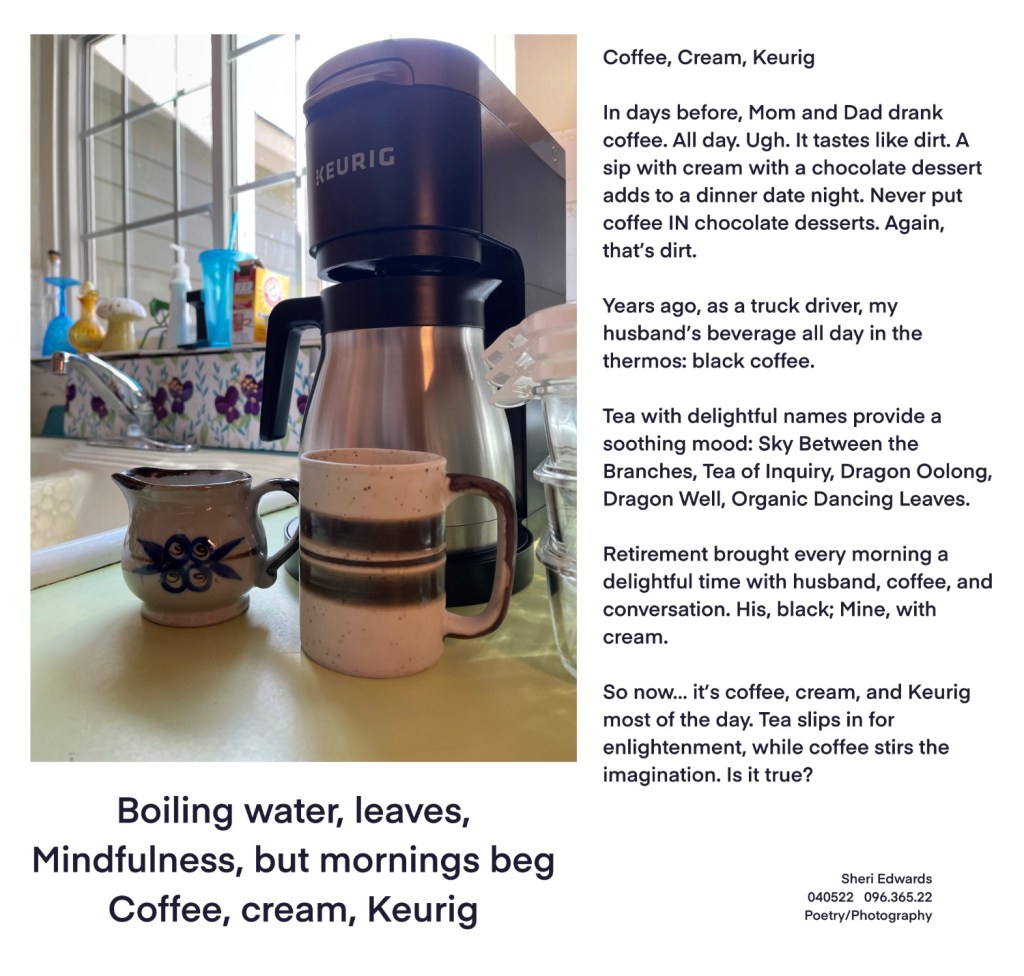 Every day, a photograph, a poem. Today I liked the sound of “Coffee, Cream, and Keurig” and remembered how I once hated coffee. Really— it’s not tasty. I drank tea. So how did coffee become a morning drink— mornings and beyond? That is this poem.