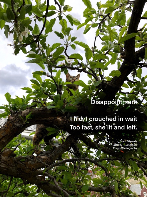 But here you see her wishing she had hid well enough to surprise a little finch or chickadee. Fortunately, they are mindful of the cat in this yard. I’m sure they share in their song, “Beware in there a cat hides flat.” They alight, grab a seed, and fly off— all too fast for the cat, thank goodness.