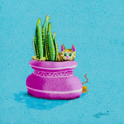 Cat in a Plant – created with Dry Ink details, Oberon Ink details and color fill, and my own texture brushes and paper.