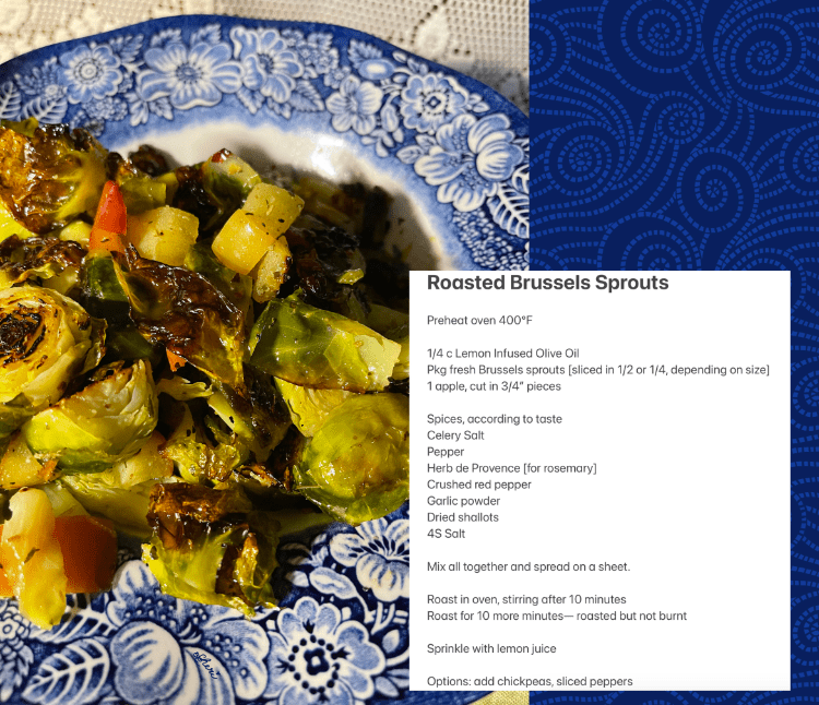 Mix together Sliced Brussels sprouts and apples, Penzey’s spices, lemon infused olive oil, roasted, not burnt at 400°F; sprinkle with lemon juice.