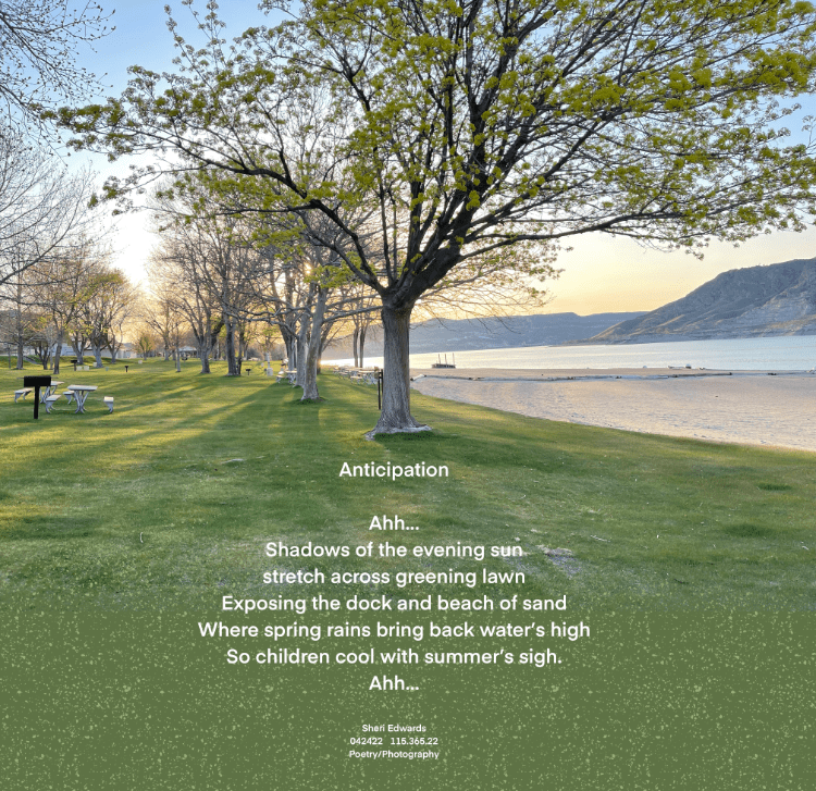 Every day, a photograph, a poem. One of our favorite summer spots is just three miles away at Spring Canyon, part of Lake Roosevelt National Recreation Area. Lake Roosevelt is the reservoir behind Grand Coulee Dam, so right now the water is low in anticipation of spring run off to prevent flooding downstream. Soon, the spring of the mountains will flow into the river and fill the lake again. Yesterday, we visited to see the expanse of sand that will be covered with water and the dock will again fill with kids seeking fun and the cooling off from the glacial waters of the mountains far away. It’s an “ahhhh”-some view now and will, indeed, produce sighs of “ahhhhh” when the summer heat is cooled by these waters.