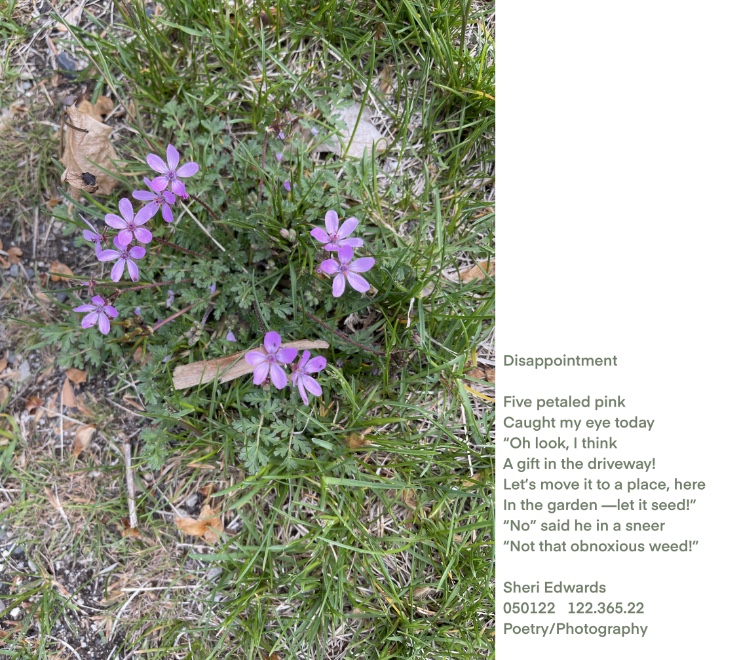 Every day, a photograph, a poem. Today I found a lovely little pink flower growing in the driveway and moving into the grass. I wanted to transplant it into the garden and let it bloom at the edges, but my husband said, “You better check that we’d not be propagating an obnoxious weed.”