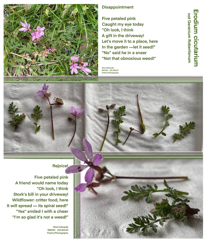 Today’s poem is “Rejoice” after my friend Sarah commented on yesterday’s post that the plant is probably common storks-bill, or Erodium cicutarium. She even sent me a link to a picture and that sent me on a research adventure. It’s called storks-bill, redstem filaree, or pinweed. It’s forage for many animals and livestock, Gamebirds, songbirds and rodents eat its seeds. It’s seeds spiral into the ground— an amazing design by nature. Here’s more about this wildflower, including it’s fascinating seed unwrapping itself and drilling into the soil: