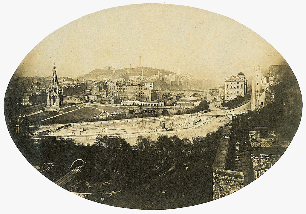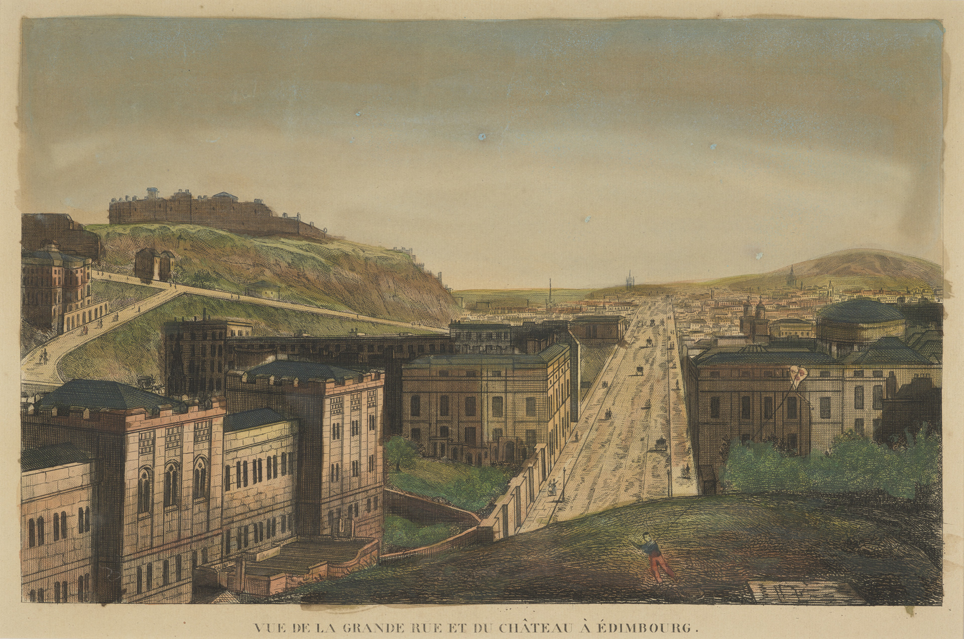 There’s a castle on a cliff in Edinburgh. A New Town was being built below. The old ’Nor Loch and the cliff separated the two. The stinky loch was being drained, but was soggy, boggy yuck. George Boyd did not want to walk all the around to the new North Bridge, so he and others began to lay stepping stones down to cross the soggy path up to Edinburgh. And then the townspeople over the course of fifty years took the rubble of the building of New Town and dumped it into the old Loch to build the new path called “the Earthen Mound.” You can see the eventual road at top left in this image from The National Galleries of Scotland: