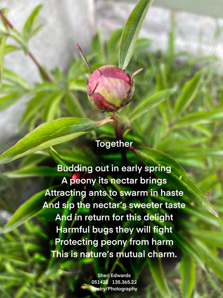 Every day, a photograph, a poem. This year the peony has again budded out and hopefully we will see another beautiful bloom or two. Our neighbors have delightfully large and lovely peonies that we also enjoy, especially when they share with us a bouqet.