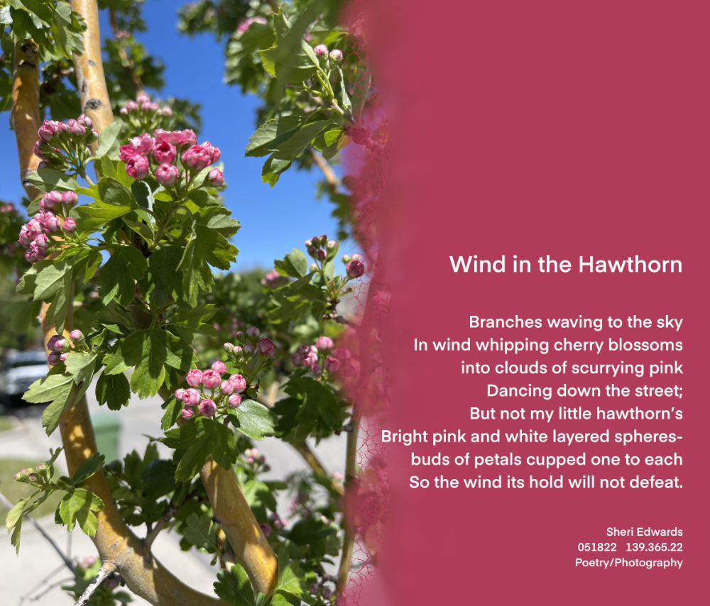 Every day, a photograph, a poem. Today was like North Dakota, a windy day— gusts pushing you down the sidewalk or against you as you lean forward, letting the wind pull back your hair. Last week the wind blew all the blossoms off the cherry trees, but today, my little hawthorn blows and the buds hold on tightly bound to stay. And the little flowers soon grow to berries that delight the birds. I love our little hawthorn.