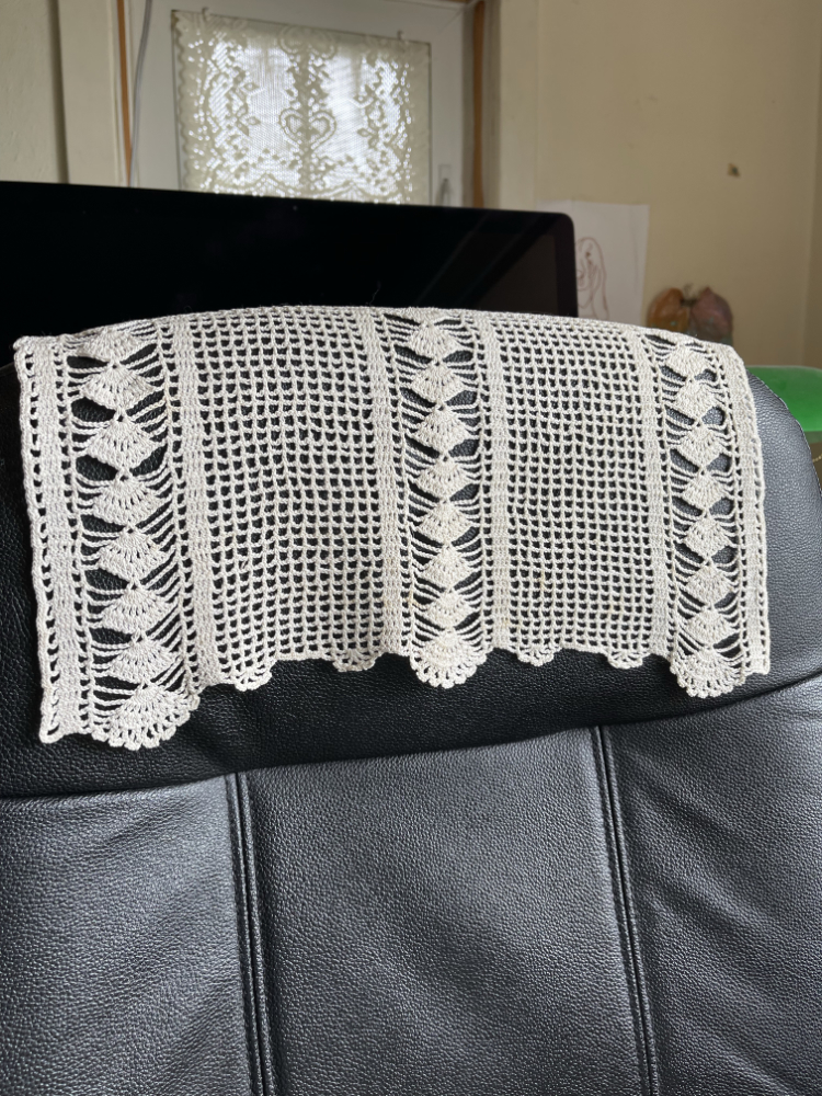 So, under my lamp on my nightstand is one of my grandmother’s antimacassars, so I draped it over our office chair and snapped a photo so I could use it as an example in the Daily Create I was creating.