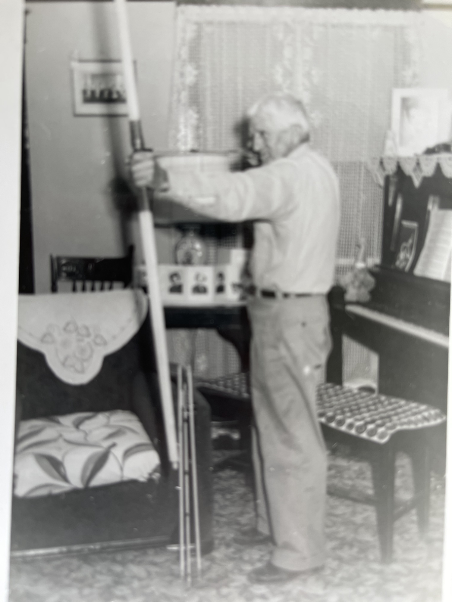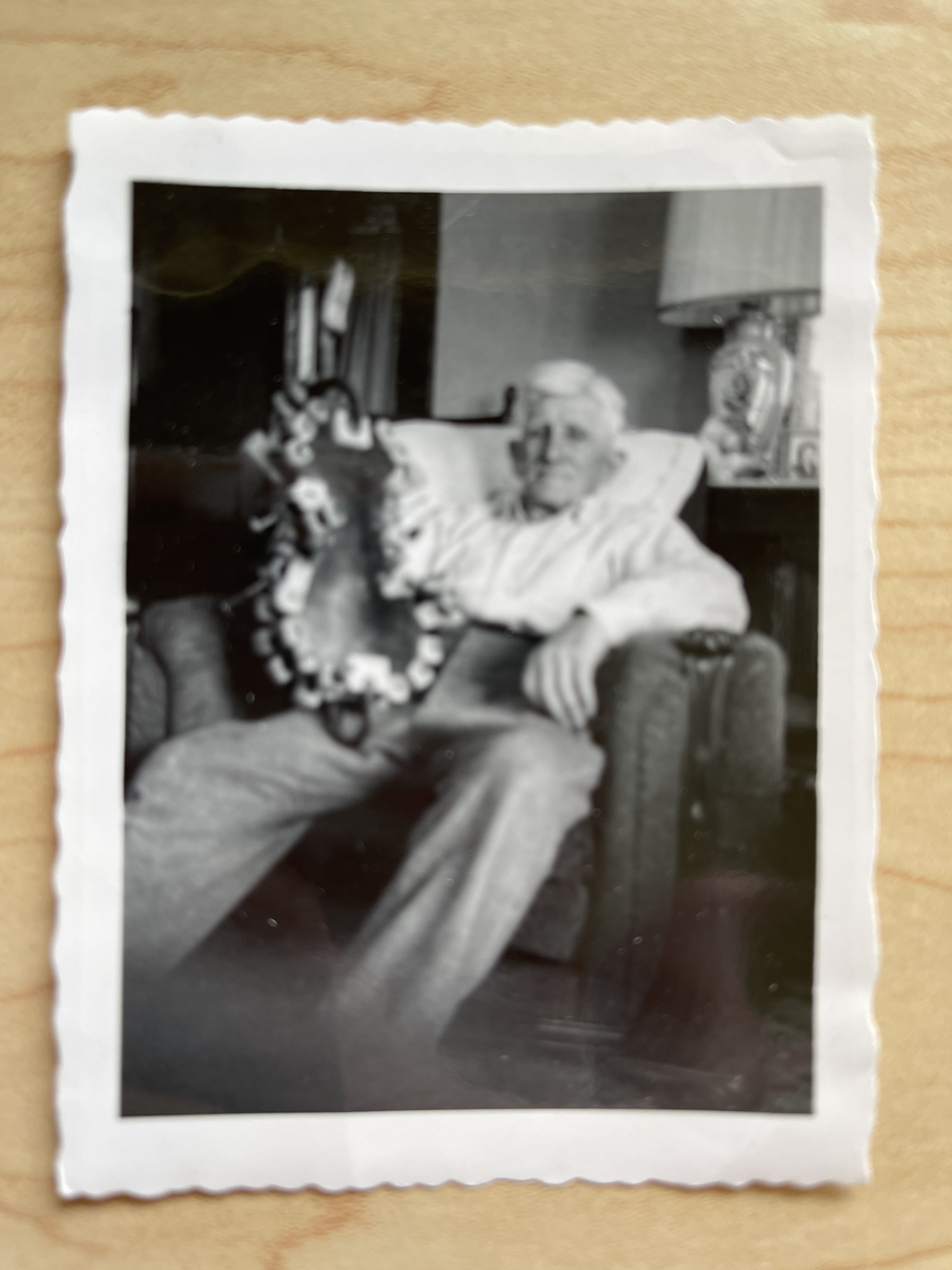 In the photo where Grandpa is reading you’ll also see a lovely flowered crocheted piece on the ottoman to keep it clean from his shoes. I imagine he came in from farming, ate, did a bit of carving, and then read himself to sleep.