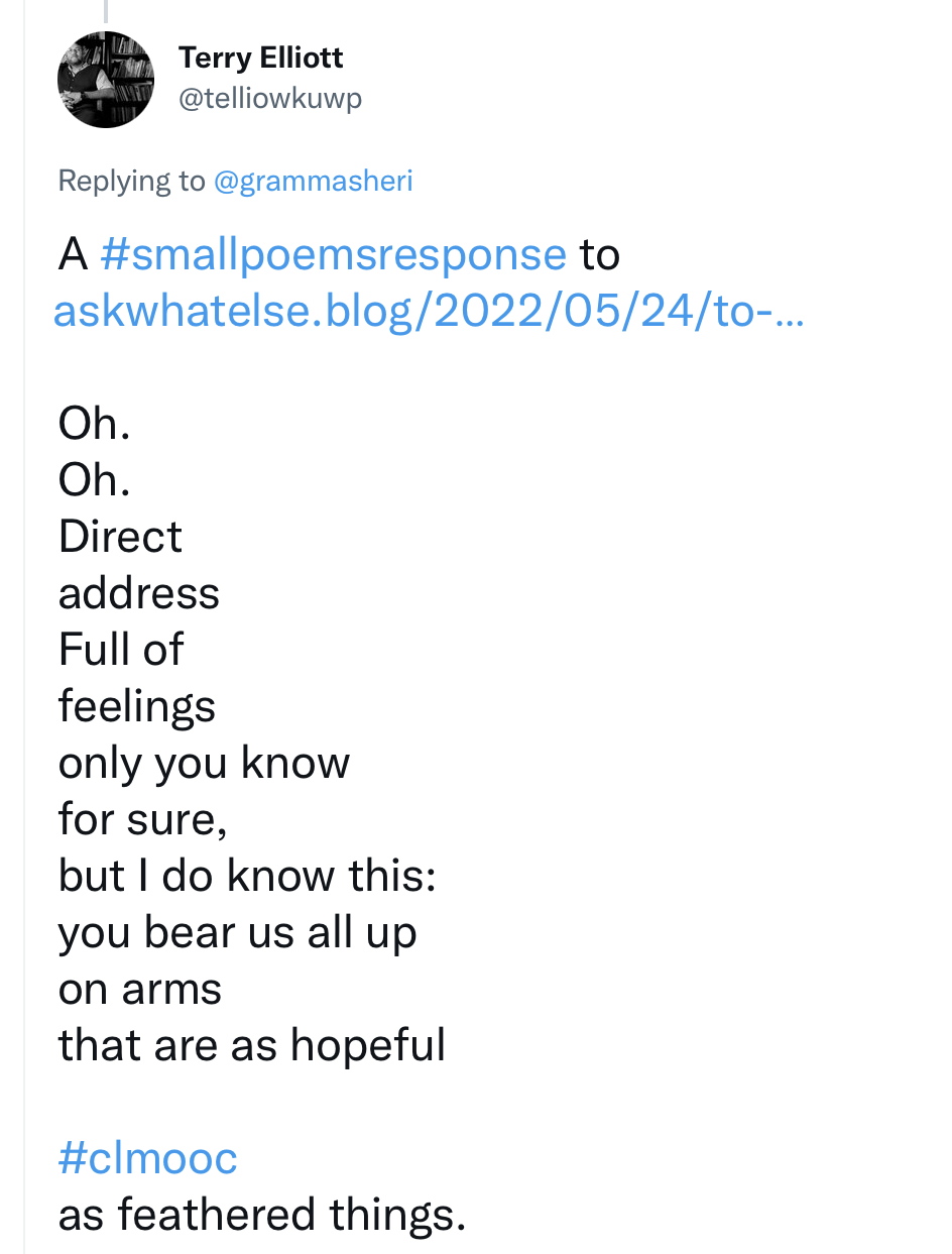 Every day, a photograph, a poem. I wandered through my day as usual— a songfest via the Daily Create which inspired a piece of art. Music that, though metaphoric and true, still brought a sense of hope in these trying times. Then a quick check of my twitter feed where the news of the massacre of elementary children — 18 and a teacher made my heart drop. I missed most of my zoom artist chat as I wondered “How will we stop this rain?” just like the song from the Daily Create— John Fogerty’s Who’ll Stop the Rain?
