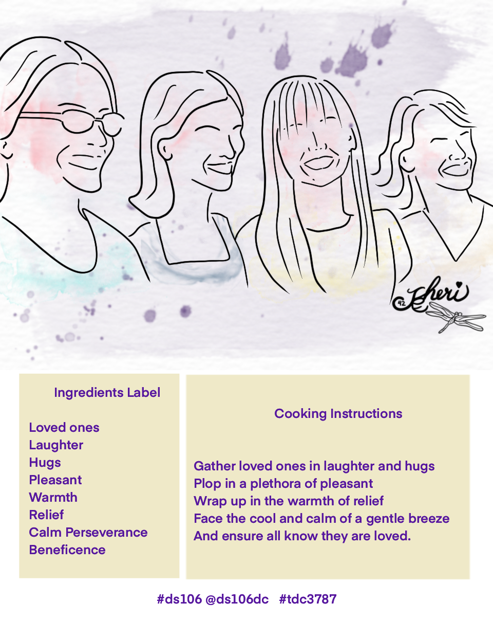 Today’s Daily Create — ds106 @ds106dc #tdc3787 – asked what our ingredients were— and I hold on to our past gatherings to keep going in this time of separation and only occasional gatherings. I remembered retreat time and so I created a picture of the four main stampers taken from Allison’s graduation party years ago and added the ingredient label as poetry: