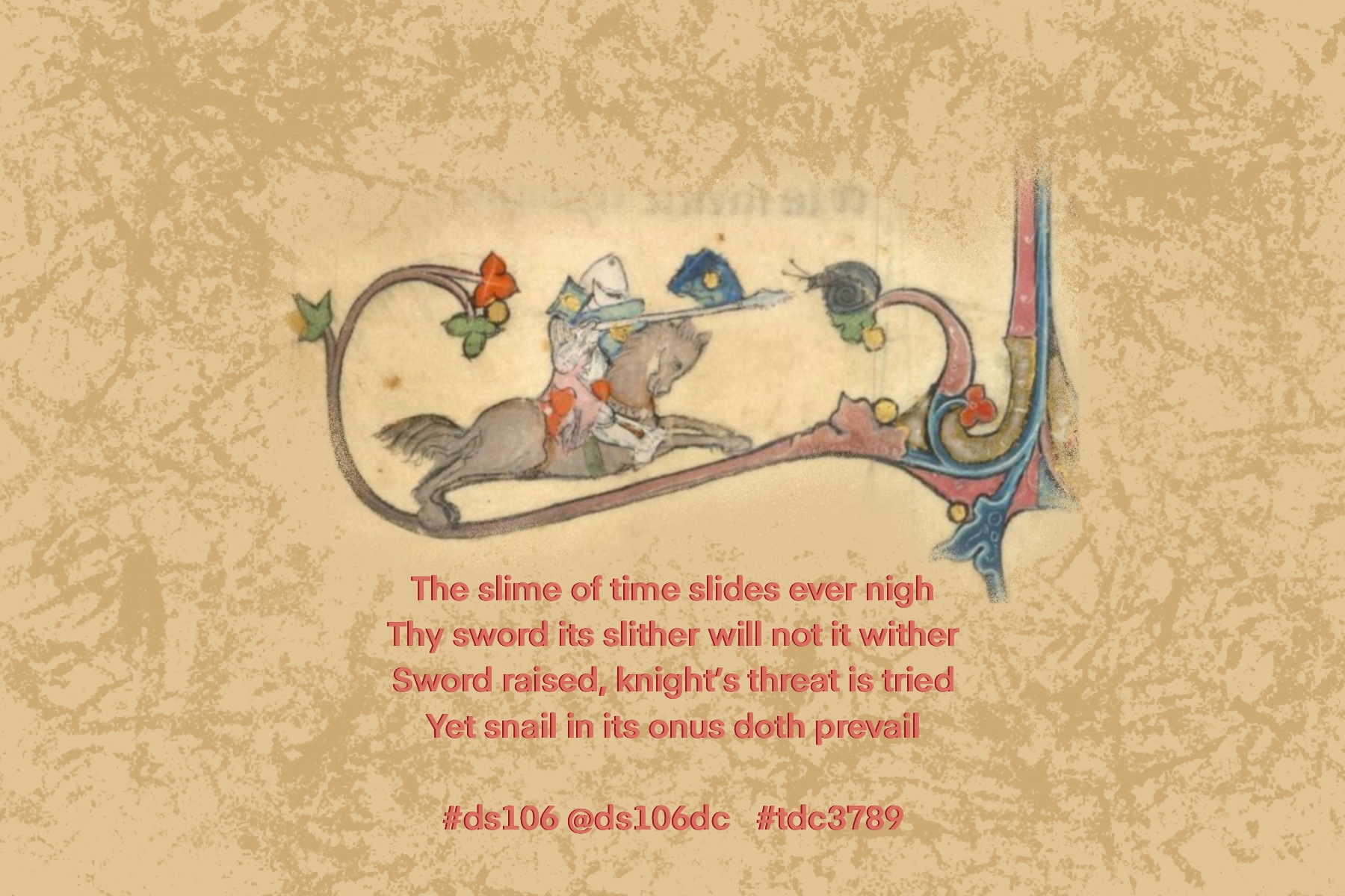 #ds106 @ds106dc #tdc3789 In medieval books, the margins often included bits of art reflective of the artist and the times. Many of them are knights fight —- snails! What could this mean?