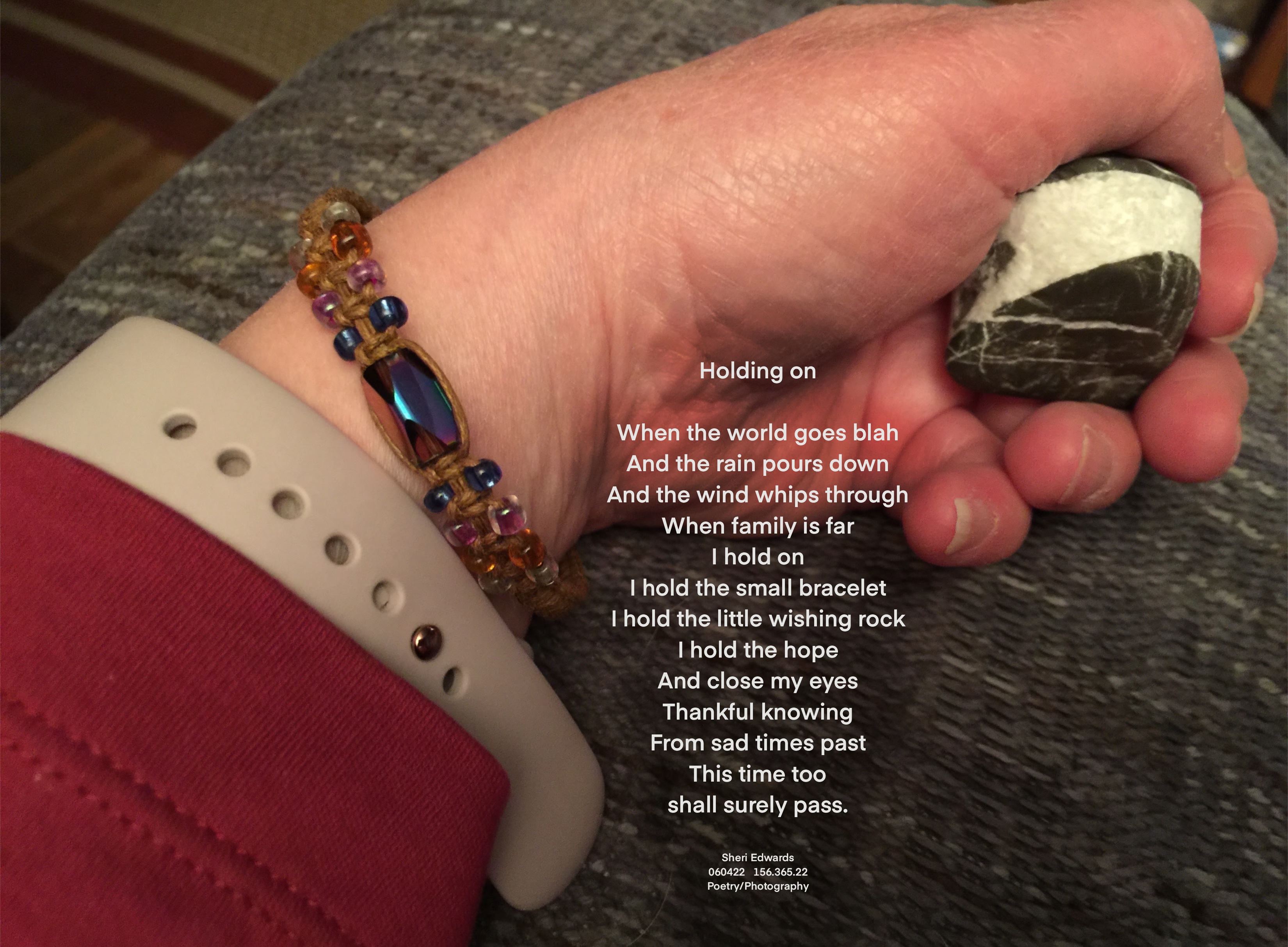Every day, a photograph, a poem. Today we get ready for our trip to a grandson’s graduation— an outside venue and small gathering. We’ll wear masks. It’s a worry though these days. So I found this picture of me wearing the bracelet that Allison made for me and the wishing rock she brought for us from Italy— two little things that I look at in their visible place in our little cottage to remind me of the family and times of love. The little things that keep us holding on to hope when we can’t be together.