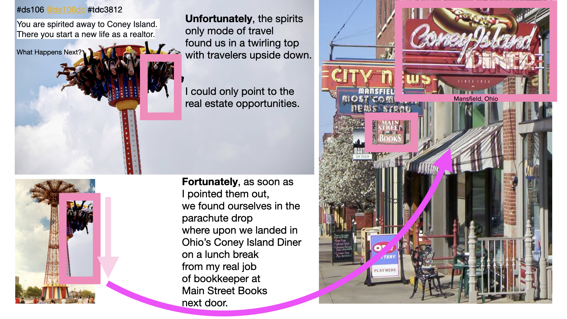 Fortunately, as soon as I pointed them out, we found ourselves in the parachute drop where upon we landed in Ohio’s Coney Island Diner on a lunch break from my real job of bookkeeper at Main Street Books next door.