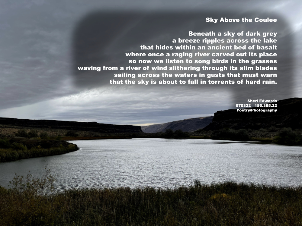 Every day, a photograph, a poem. On a trip to a lake we had not seen, we could see the awesome power of once raging floods that carved the coulees of Eastern Washington beneath as sky just as awesome in its magnificence.