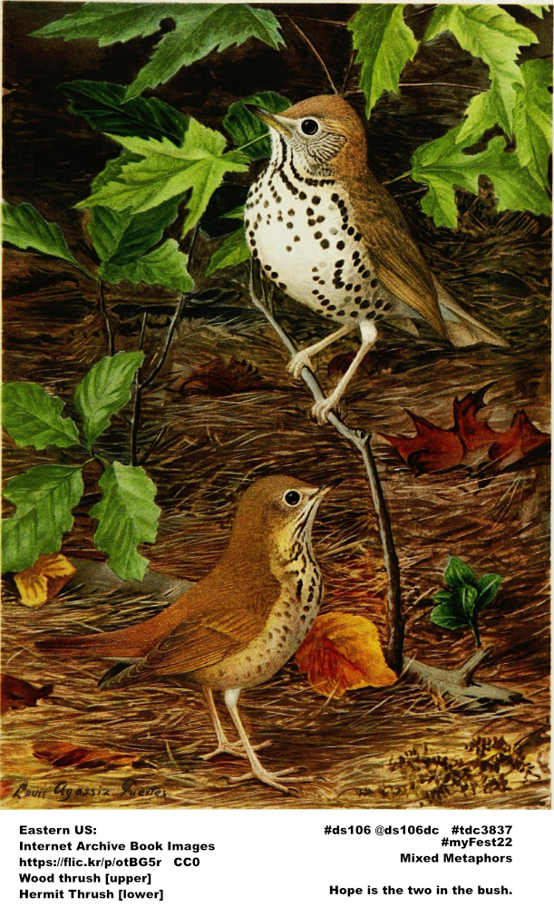 My mixed metaphor, illustrated by the two thrush in bush, an Internet Archive Book Image CC0 on Flickr, combines two metaphors: