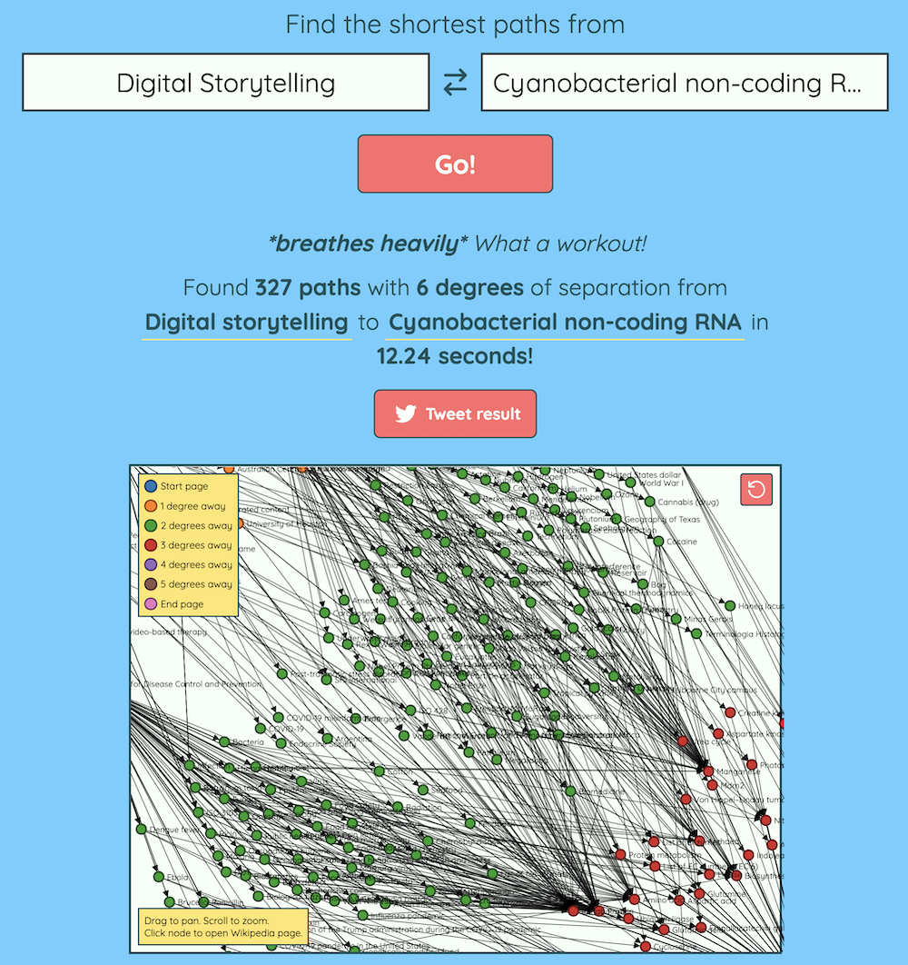 Today we were to find the highest degree of separation between Wikimedia webpages, with one being “Digital Storytelling,” and the challenge to find six degrees.