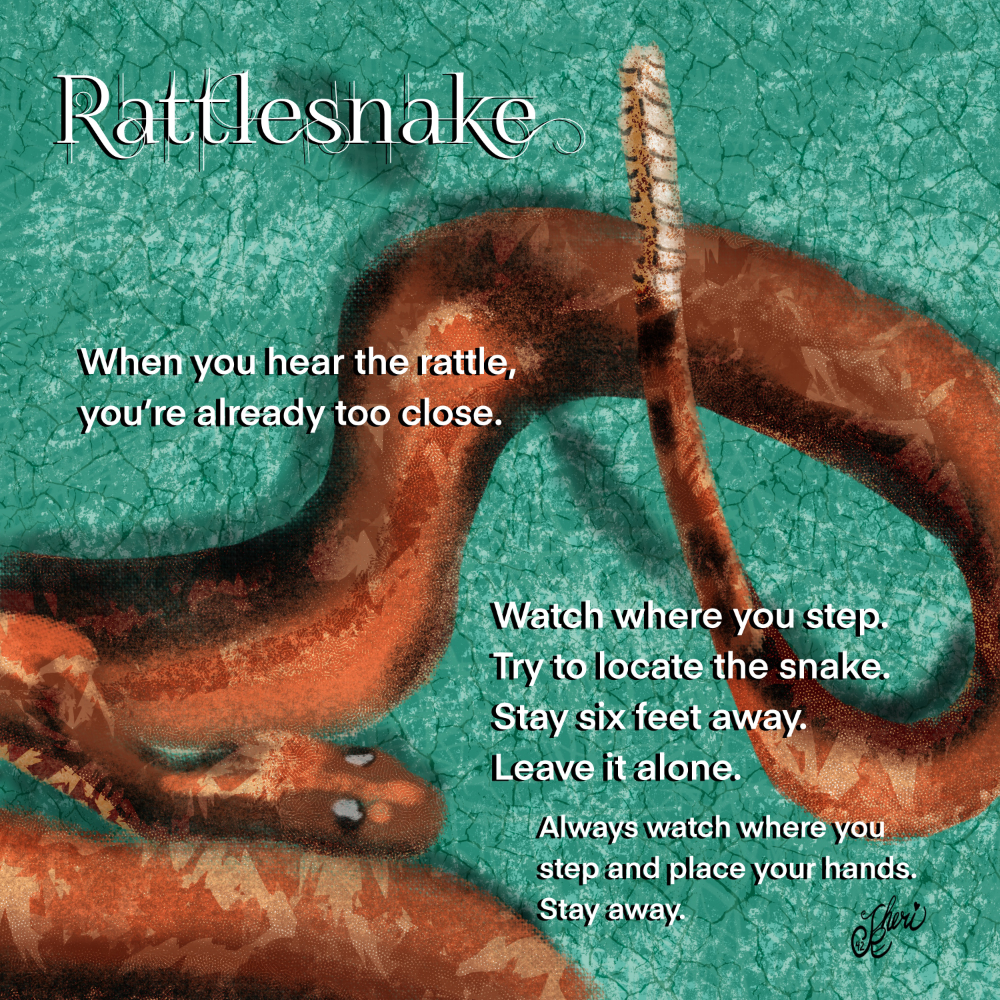 If you hear the rattle, you’re already too close. Try to determine where the snake is so you can stay six feet away. Do not move things around it. Do not try to touch it, even with a stick. Leave it alone. They are poisonous and bite.