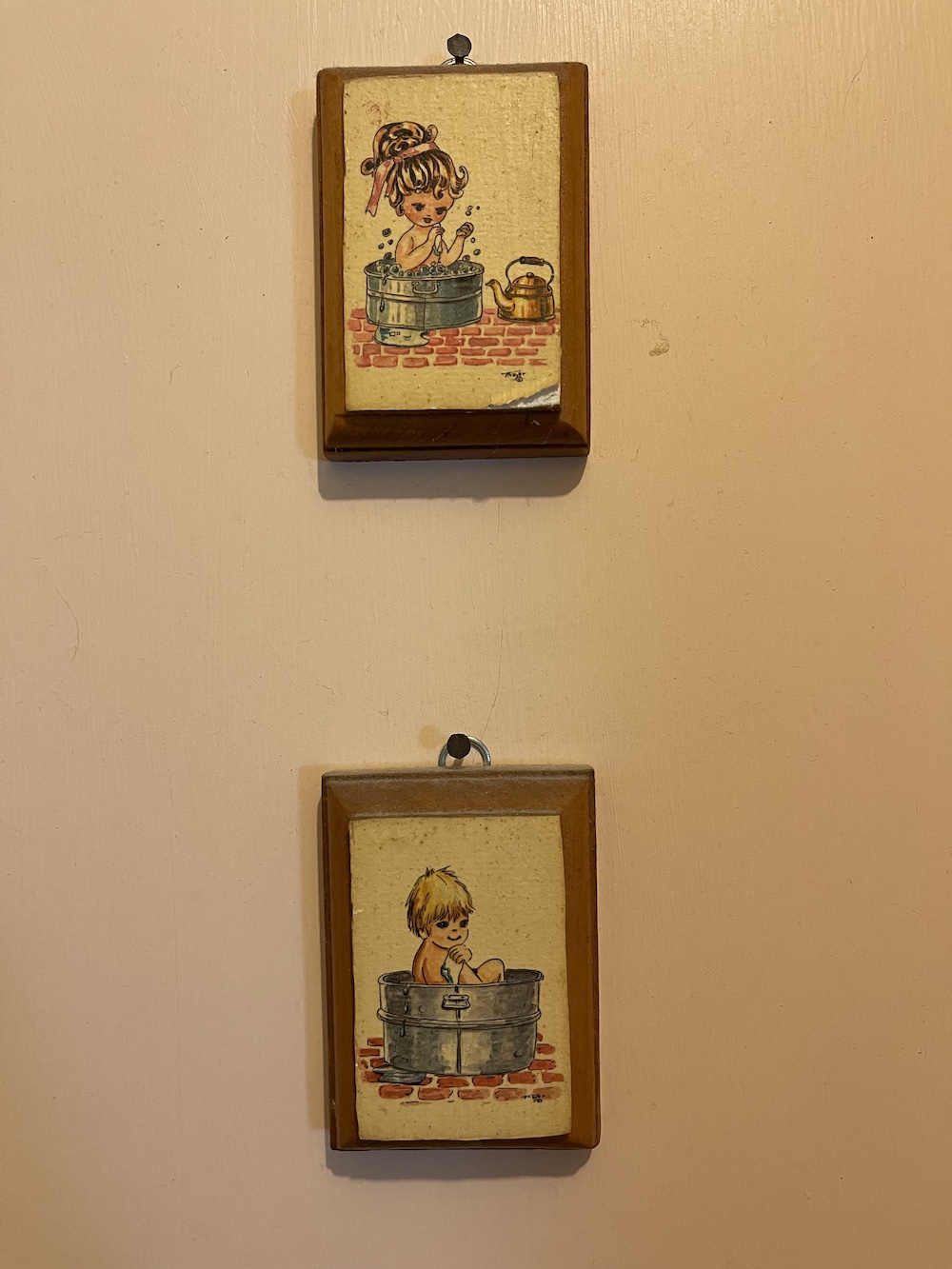 When I was a teenager, Decoupage was popular and I created a set of bathroom decorations for my mom. And years ago they arrived to be placed on my bathroom door, where they still are. So that become the reference for my art today.