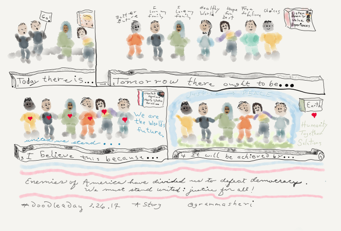 A Story: Today, there is… fear discrimination divisions intolerance power wars hatred Tomorrow there ought to be… calm listen share accept understand hope compromise love: listen openly; value experiences I … Continue Reading SOL17 DoodleaDay 26 United We Stand