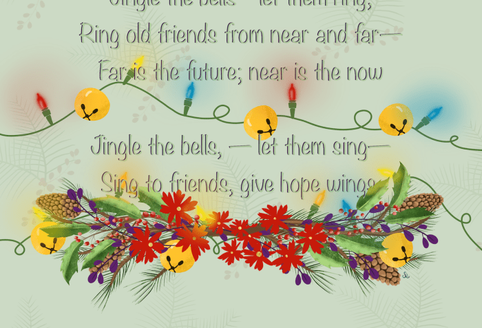 Jingle the bells,–let them sing– sing to friends, give hope wings.