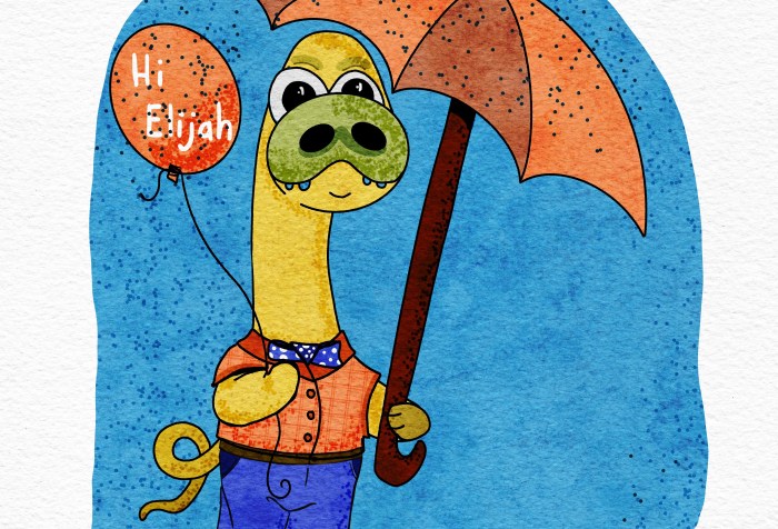 Alan Allosaurus takes a walk in the rain to deliver a balloon to Elijah.