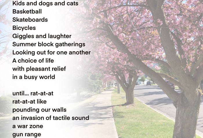 Evidence There, walking in the evening beneath the sky of pale blue along the grey sidewalk lined with newly mowed lawns, I remember the chatter in the afternoon shadow … Continue Reading NaPoWriMo Evidence