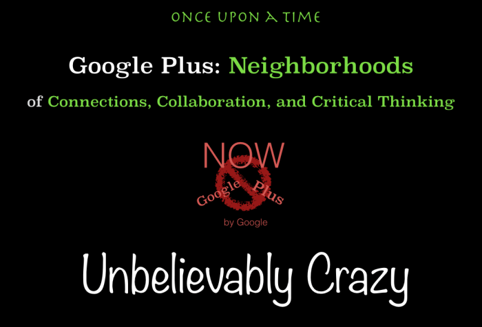 Have you heard the news? Google is ending Google Plus. [ Neowin , Google Plus ] My communities have been so important to my profession as an educator — to think … Continue Reading #sol15 Unbelievable GooglePlus Sadness