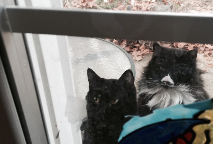 Two cats. Not mine. Huddled, cuddled asleep on a patio chair. Two cats. Not mine. Ears alert Awakened, Aware. Two cats, Not mine. Gaze inside Are you there? Two cats, … Continue Reading #sol15 Two Cats Not Mine